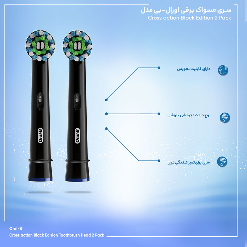 سری یدک مسواک برقی اورال بی مدل CROSS ACTION حاوی 2 عدد سری مسواک است و برای کسانیکه به سلامت دهان و دندان خود اهمیت می دهند، انتخابی ایده آل به نظر می رسد. دندانه های این سری قدرت تمیز کنندگی بالایی دارد و پلاک های دندان را ازبین می برد. علاوه بر این، برس گرد این سری طوری طراحی شده که به دندان های عقب به راحتی دسترسی پیدا می کند و همه ی دندان ها و فواصل بین آن ها را به طور کامل تمیز می کند و از ایجاد لکه روی دندان ها جلوگیری می کند. دندانه های سری یدک مسواک برقی اورال بی بسیار لطیف و در عین حال کارامد است. به طوری که باعث حساسیت و اذیت شدن دندان و لثه نمی شود اما به خوبی می تواند دندان ها را از هرگونه میکروب و مواد غذایی تمیز کند. این محصول از اورال بی سرییدک مسواک های برقی است و با هر یک از مسواک برقی های اورال بی قابل استفاده است. همچنین مجهز به تکنولوژی نوسان وچرخشی برای حداکثر تمیز کردن و سفید کردن دندان ها است. به طور کلی و بر اساس توصیه دندان پزشکان بعد از تغییر رنگ الیاف برس مسواک، زمان تعویض سری فرا رسیده است. سری های اورال بی قیمت بسیار مناسبی دارند و خرید این پکیج دو عددی از نظر اقتصادی مناسب و مقرون به صرفه می باشد. مطالعات مختلف نشان می دهند که استفاده از مسواک های برقی در بیشتر مردم سودمند است چرا که بدون توجه به توانایی فردی، یک تکنیک خوب مسواک زدن را فراهم و انگیزه فرد را تقویت می کنند و مقبولیت بیشتری در طولانی مدت دارند. از این رو استفاده از مسواک برقی به همه افراد توصیه می گردد. مسواک برقی اورال بی در سطح جهان بیش از برندهای دیگر از سوی دندان پزشکان توصیه و مورد استفاده قرار می گیرد.