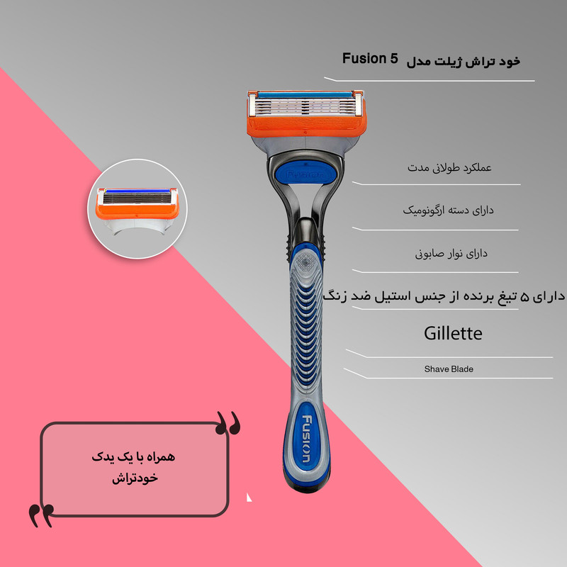 خودتراشها از جمله محصولات مهم و کاربردی هستند که در انواع گوناگونی تولید و عرضه میشوند که با توجه به خواص و کاربرد آنها با قیمتهای متفاوت خریداری می شوند و مورد مصارف متعدد قرار می گیرند. خود تراش ژیلت مدل Fusion 5 دارای تیغههای پنج لبه بسیار با کیفیتی بوده که فقط کافی است یکبار آن را بر روی پوست خود کشیده و اصلاح تمیزی را تجربه کنید. این محصول دارای نوار صابونی بوده که عملکرد این خودتراش را بسیار روان و عالی کرده است. برای داشتن یک خودتراش خوب، باید سه چیز را مد نظر داشته باشید. اول، از تیزی و بُرشِ تیغ اصلاح مطمئن باشید. دوم، برند خودتراش را فراموش نکنید و از کیفیت آن اطمینان حاصل کنید. سوم، از کیفیت و مرغوب بودن بدنۀ آن نیز غافل نشوید. اگر قصد خرید یک خودتراش بسیار با کیفیت و مقرون به صرفه را دارید این محصول بهترین گزینه برای شما است.