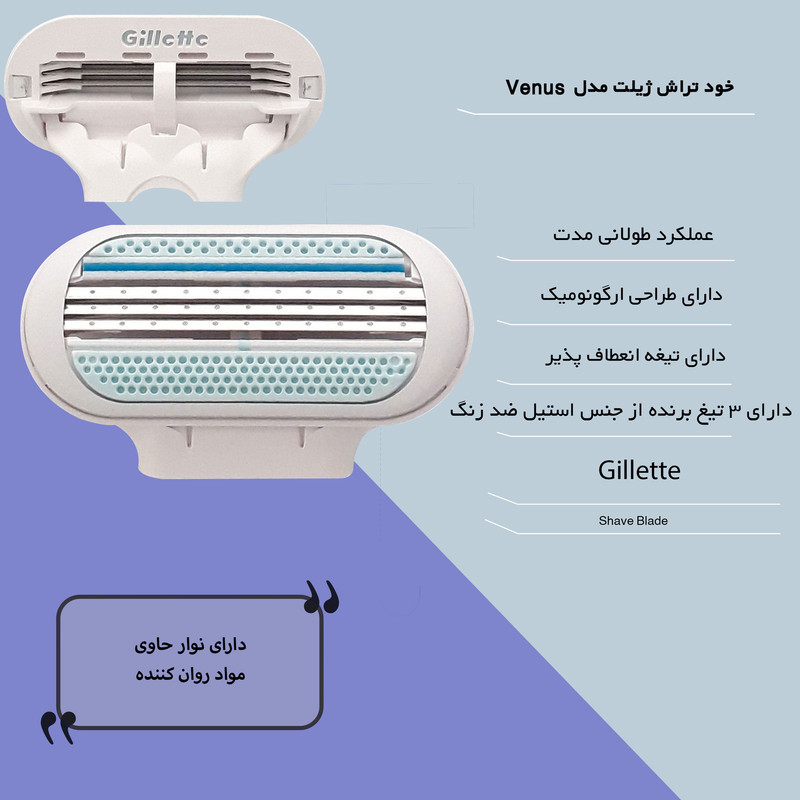 تیغ یدک ژیلت مدل « Venus » در بستهبندی 4 عددی عرضه میشود. این مدل علاوه بر کاهش زمان اصلاح، قابلیت انعطافپذیری و فنری بهتری نسبت به مدلهای قبل دارد و این مدل پیشرفتهتر است و از روانکنندههای بهتر و تیغهای ضد اصطکاک استفاده شده است. این تیغها از استیل ضد زنگ تهیه شده است. میزان برندگی این تیغها بسیار بالا است و با کوچکترین اشاره اصلاح شما صورت میگیرد. میتوانید این تیغ یدک را برای تمام دسته تیغهای سری «Venus» استفاده کنید.