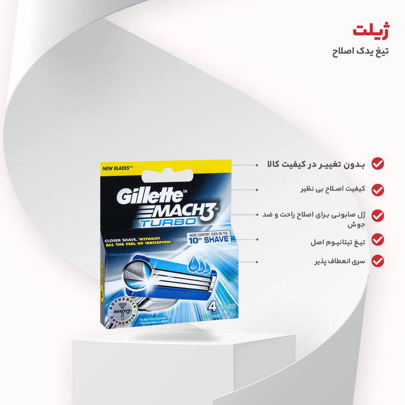 تیغ یدک اصلاح ژیلت مدل مچ تری توربو بسته 4 عددی (ژیلت)، برای استفادهی منظم، بیخطر و بیوقفه از این مدل خودتراش عرضه شده است. سری تیغ مگنوم ام 5، دارای 5 تیغه با روکش تیتانیوم است. در بالای این تیغهها، یک نوار ژل غنی شده با ویتامین E و عصارهی آلوئه ورا قرار دارد. این نوار در حرکت روان و بیخطر تیغ بر پوست، بسیار موثر است و پوست را در حین اصلاح و پس از آن آرام و خنک نگه میدارد. این سری، بسیار موثر در اصلاحی سریع و دقیق است. برای تعویض سری خودتراش توربو، کافیست تا دکمهی بالای دسته را فشار داده و به راحتی با اندکی فشار، سری را درون آن جا داد.از آنجاییکه بیشتر آقایان به طور روزانه صورت خود را اصلاح میکنند، نیاز است تا از خودتراشی با کیفیت استفاده کنند. رعایت در انتخاب محصول، کمک میکند تا شادابی و لطافت پوست از بین نرود. همچنین با خرید این محصول به همراه دستهی آن، میتوان در سفر نیز هر لحظه آراسته ظاهر شد. برند ژیلت سعی بر آن داشته تا با در نظر گرفتن سلامت پوست و ظاهر آقایان و خانمها، خودتراشهایی با کیفیت و کارایی مطلوب، مطابق با تکنولوژی روز تولید کند. این برند به غیر از رعایت کیفیت در ساخت، به نوع و شکل بستهبندی محصولاتاش نیز توجه ویژهای کرده است. بستهی چهار عددی یدک توربو، اصلاح روزانه را به صرفه و راحت میکند.