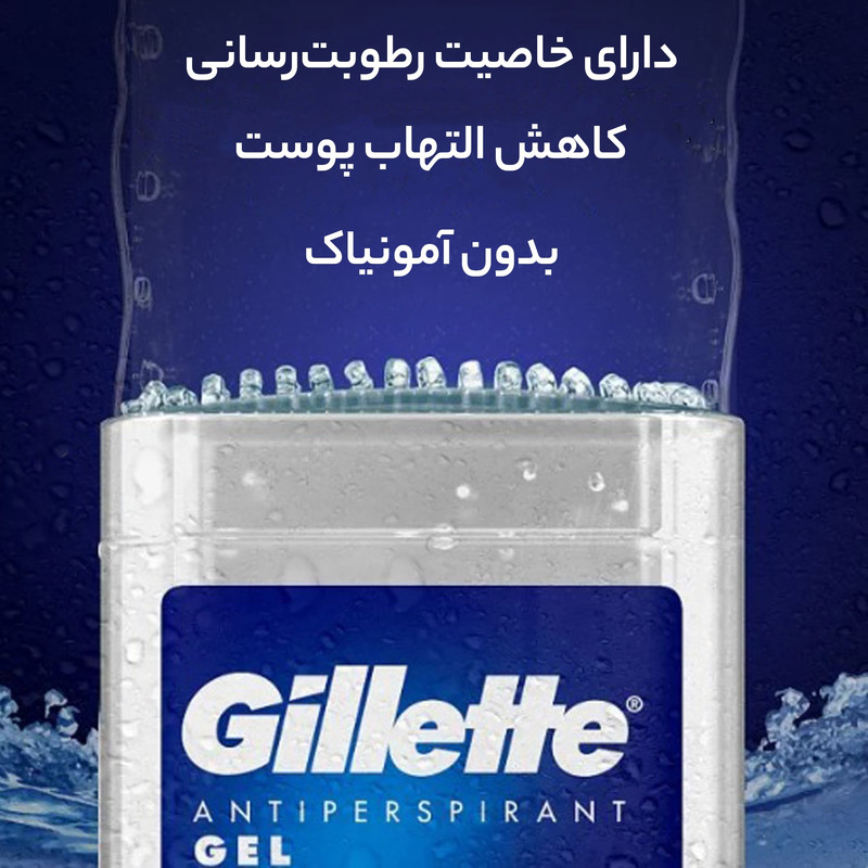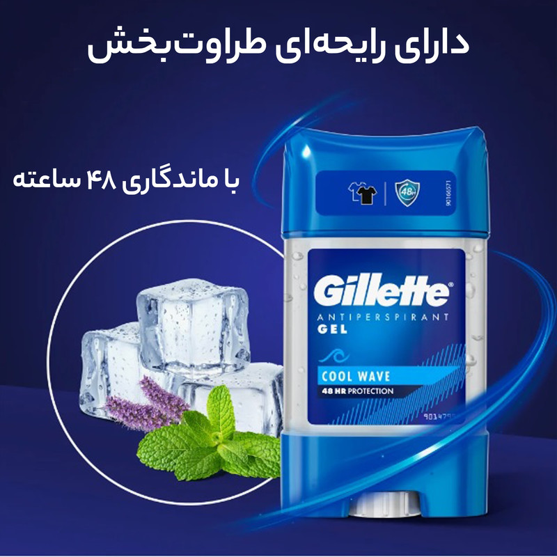 مام ژله ای ژیلت حاوی دانه های آبی ، از طریق نابود کردن باکتری هایی که مسئول بوی بدن هستند عمل می کند.مام ژله ای کول ویو ژیلت، با ماندگاری 48 ساعته خود احساس راحتی را برای شما به ارمغان خواهد آورد. به عنوان یک امتیاز دیگر، این ژل پوست زیر بغل را لطیف کرده و موجب کاهش احساس سوزش و آماس(التهاب) پوست پس از تراشیدن مو می شود و برتری دیگر این محصول بر سایر محصولات مشایه ، عدم استفاده از آلومینیوم در ترکیب آن است که ماده ای سمی و خطرناک میباشد این دئودرانت از برند ژیلت با فرمولاسیون ویژه خود با از بین بردن باکتری های سطح پوست می باشد و هیچ لکه ایی روی لباس ایجاد نمی کند. این مام ضد تعریق دارای رایحه طراوت بخش و دارای خاصیت رطوبت رسانی بالا به پوست می باشد.