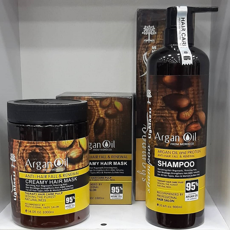 شامپو تقویت کننده و ترمیم کننده مو لایتنس مدل argan مناسب موهای آسیب دیده حجم 900 میلی لیتر به همراه ماسک مو لایتنس مدل argan oil حجم 1000 میلی لیتر