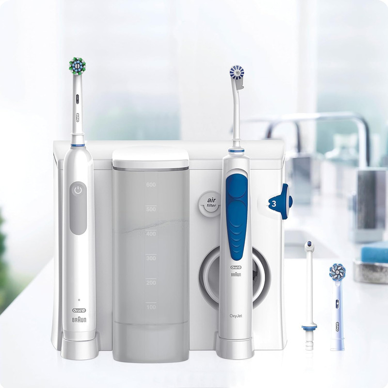 ORAL HEALTH CENTER PRO SERIES 1 یک دستگاه حرفهای تمیزکننده دهان و دندان با فناوری میکروحباب و واتر جت است که به بهبود سلامت لثه و پاکسازی عمیق دهان کمک میکند. این دستگاه شستشوی دهان، بین دندانها و زیر خط لثه را عمیقاً تمیز میکند. ۵ سطح فشار آب برای یک تجربه تمیز کردن منحصر به فرد دارد انتخاب بین ۴ جت آب: جت هدفمند، جت چرخشی، جت فشار بالا یا جت چندگانه. ویژگی اصلی این دستگاه ترکیب آب و هوا برای ایجاد حبابهای ریز جهت تمیز کردن پلاکها و جرمهای بین دندانی است. از دیگر ویژگی های این دستگاه :1.تکنولوژی میکروحباب:ترکیب هوا و آب برای تمیز کردن ملایم و مؤثر.2.تنظیمات فشار:امکان تنظیم فشار آب در 5 سطح مختلف برای افراد با حساسیتهای مختلف.3.سر نازل چرخشی:پوشش کامل مناطق سختدسترس. 4.مخزن آب بزرگ:ظرفیت کافی برای چندین بار استفاده بدون نیاز به پر کردن مجدد. در مقابل واترپیک: Oral-B OxyJet به لطف فناوری میکروحباب، یک گزینه ملایمتر و مناسبتر برای افراد با لثههای حساس است. در مقایسه با نخ دندان: تمیز کردن بهتر مناطق سختدسترس و راحتی بیشتر است. دارای سنسور فشار برای محافظت بیشتر از لثه: در صورت اعمال فشار بیش از حد، ضربانها را متوقف کرده و سرعت مسواک زدن را کاهش میدهد. ۳ برنامه تمیز کردن برای یک تجربه تمیز کردن شخصی: تمیز کردن روزانه، حساس، روشن کننده است.