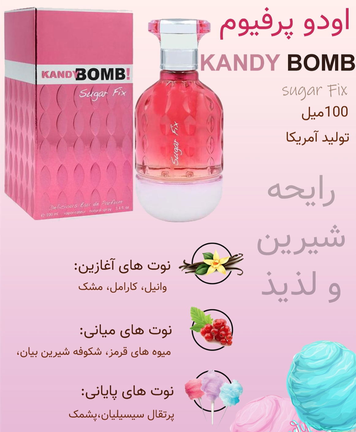 عطر زنانه کندی بوم شوگر فیکس با رایحهای شیرین و دلپذیر، حس جذابیت و شادی را منتقل میکند. انتخاب عالی برای خانمهایی که به عطرهای شیرین، خاص و نوستالژیک علاقه دارند. این پرفیوم با کیفیت بالا در کشور آمریکا تولید شده و برند NU PARFUMES اصالت آن را تضمین میکند.
