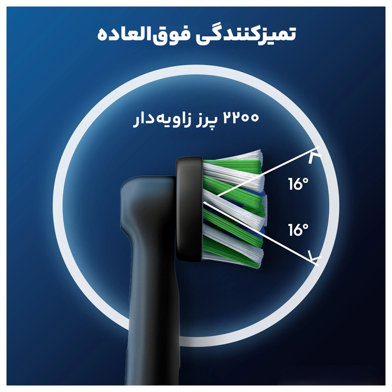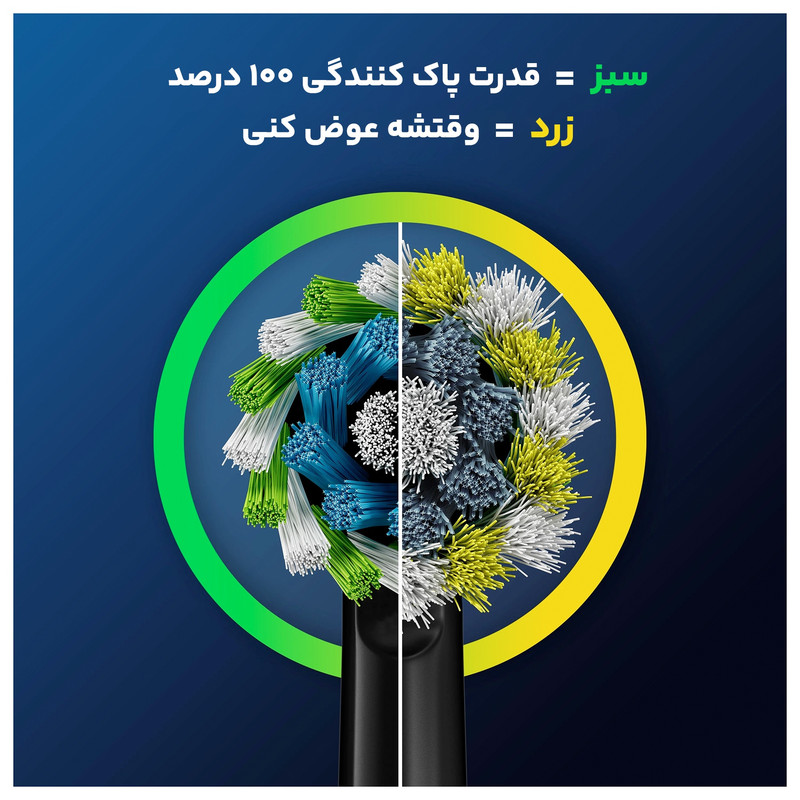 سری مسواک Oral-B مدل PRO دارای برس های منحصر به فرد X شکل با زاویه 16 درجه هستند که در مناطقی که نمونه های معمولی نمی توانند کارآیی تمیز کنندگی مطلوبی دارند تمیز می کنند. در زمان اتمام کارایی سری، برس آن از سبز به زرد تبدیل می شوند و به شما یادآوری می کند که چه زمانی آن را تعویض کنید تا اثر تمیز کنندگی 100% حفظ شود.