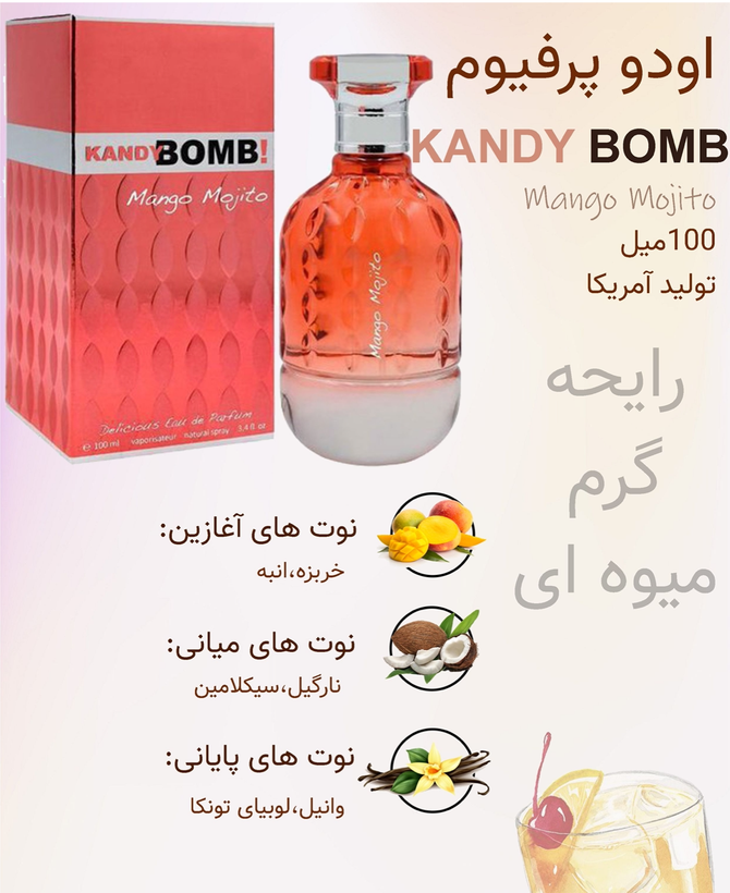 عطر زنانه کندی بوم! منگو موهیتو ترکیبی منحصر به فرد از نتهای میوهای و نعنایی است که حس طراوت تابستان را یادآور میشود. مناسب برای خانمهایی که به دنبال عطری خنک، خاص و شاداب برای استفاده روزمره، مهمانی و دورهمی هستند. این پرفیوم ساخت آمریکا بوده و با تضمین اصالت توسط برند NU PARFUMES عرضه میشود.